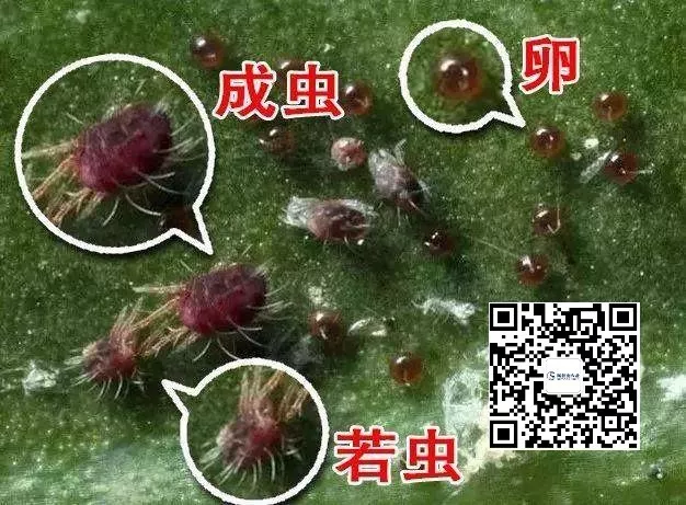 红蜘蛛主要有四个生长阶段——卵期、幼虫期、若虫期和成虫期(也有说法是卵期、幼虫期、前期若虫、后期若虫和成虫五个阶段),就像上面的配图,往往会出现几个阶段的红蜘蛛会共存在一个叶片上。而目前还没有没有一种药物能够同时杀掉各阶段的红蜘蛛,因此,如果在高峰期之前没有及时喷药杀灭卵或者幼虫,等到高峰期四个阶段的红蜘蛛“齐聚”,只用一种药是远远不够的!